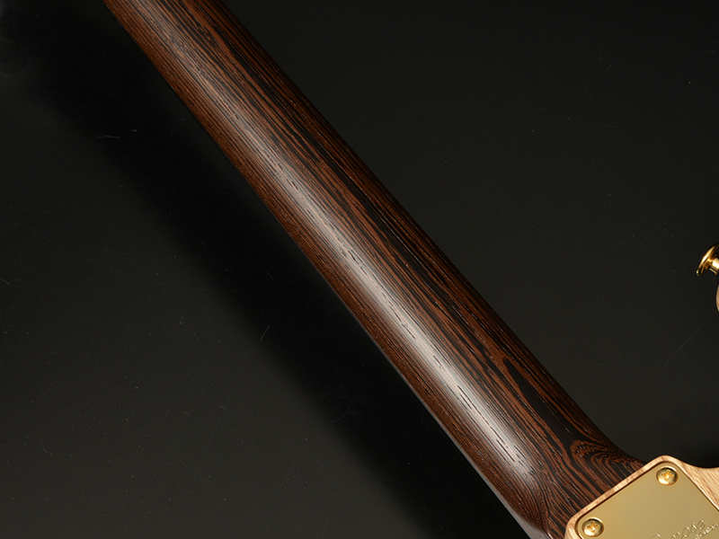 Wenge:ネックに使用されているWengeは、リップルマークとよばれるさざ波のような木目が特徴的なアフリカ産の木材です。肌目は粗いが大変強度が高く、硬いことから特異な木材として知られています。その音は硬さはなく、重厚感や存在感のある中低音域に魅力を感じます。