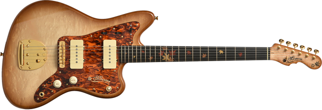Autumn Leaves:Momose初の秋特別モデル。ボディトップ材に「カエデ」、バック材にアッシュを採用しました。秋の紅葉をモチーフとし、指板にはインレイのもみじの葉が揺れ、ボディカラーはブラウンバーストカラーで仕上げています。デザインはもちろんですが、使用している材からも秋を感じることができる1本です。