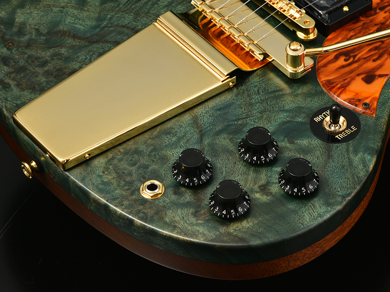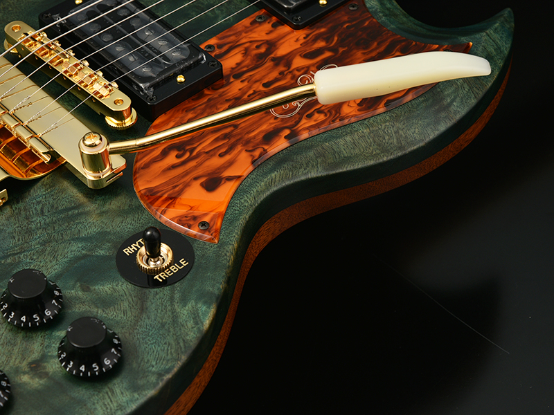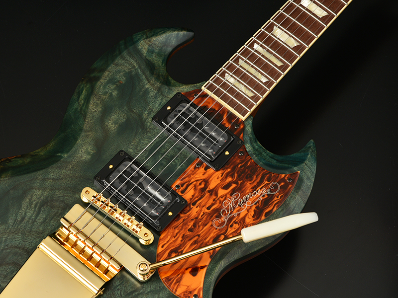 Mojotone/Level Head:ピックアップには、ハイゲインハムバッカー"Mojotone/Level Head"を採用しました。低音の巻弦側にはアジャスタブルポールピースを使い、タイトかつクリアな音を出力。高音のプレーン弦からは太く豊かな音が出るように設計されています。バンドでミックスしたときに抜けが良く、オーバーサイズのセラミックマグネットにより、高出力で、パンチの効いているサスティン豊なトーンを生み出します。