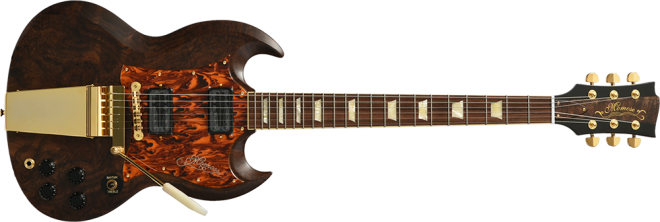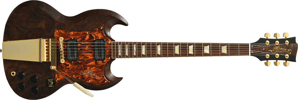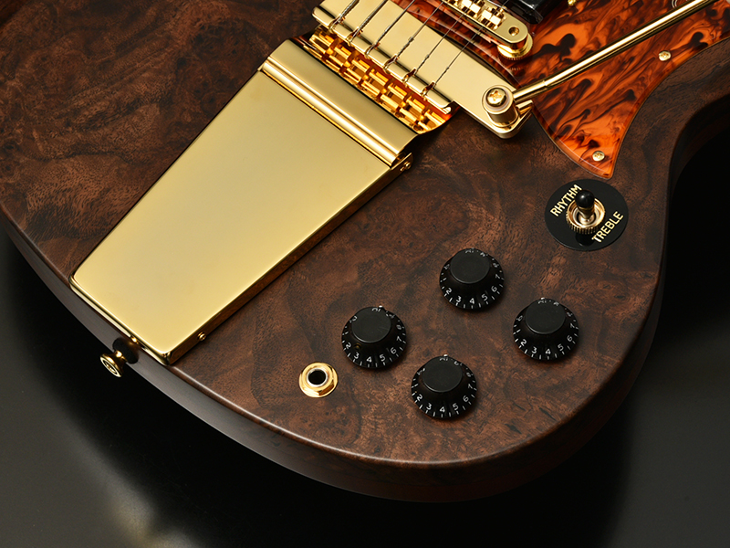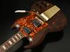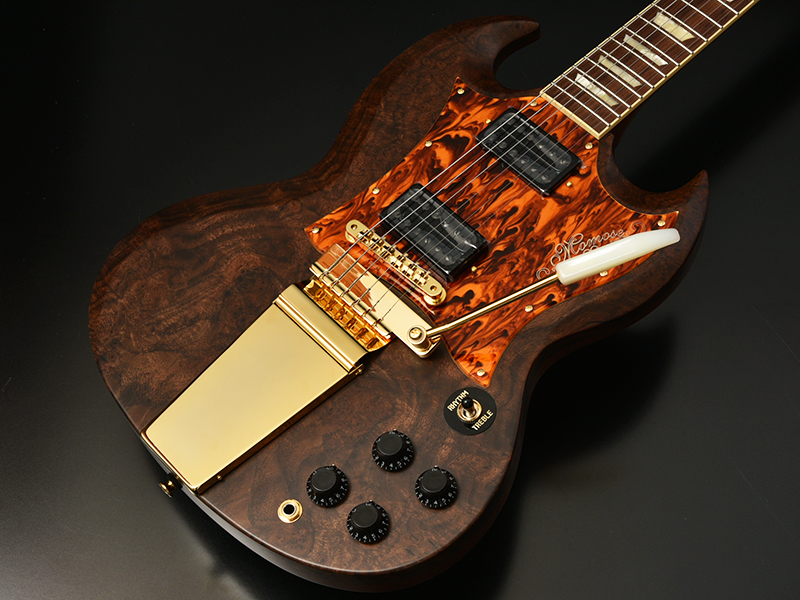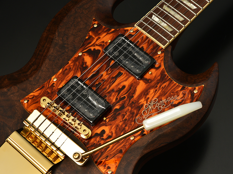 Claro Walnut:ボディトップにはクラロウォルナットを採用しました。マホガニー、チークと並んで世界三大銘木の1つに数えられる”ウォルナット”。クラロ・ウォルナットは比較的成長が遅く木材として加工できる木が非常に少ない木です。また、乱伐により大木が無くなり大変希少な高級木材として扱われています。美しい色調の変化と独特の模様が魅力的な木材です。トップ材とバック材をハーフ&ハーフの割合で贅沢に使用しています。