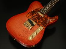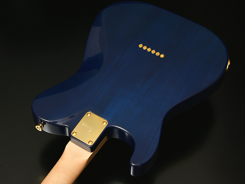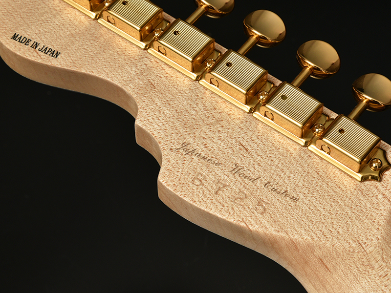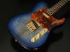 Flame Kaede:Japanese Wood Customとして和材を採用したギターを制作いたしました。ボディトップにはフレイム杢の出たカエデを採用。きめ細かく硬質で弾力性があり、材面には絹のような光沢が出ます。杢目を活かした藍色のバーストカラーで仕上げています。ボディバックには栓の木(センノキ)を採用しました。