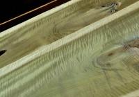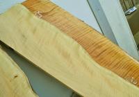 フローリング等で見かける桜の木材には樺など、桜の木とは似ているものの、みなさんがイメージするものとは異なる木材が含まれていますが、工場で使用されるものは、おもに本桜という日本古来より親しまれる桜をギターに使用しております。くわえて揺らめくような杢が入った個体を厳選しています。