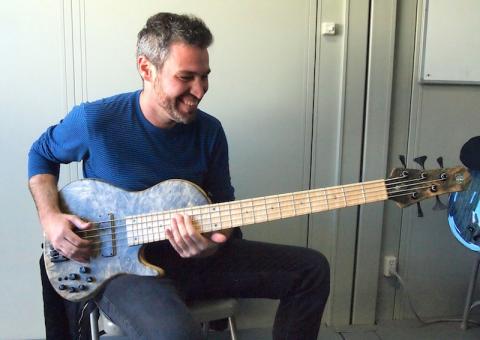 会場に着くなり楽屋に案内され、早速持って来たベースを試すPOPO。