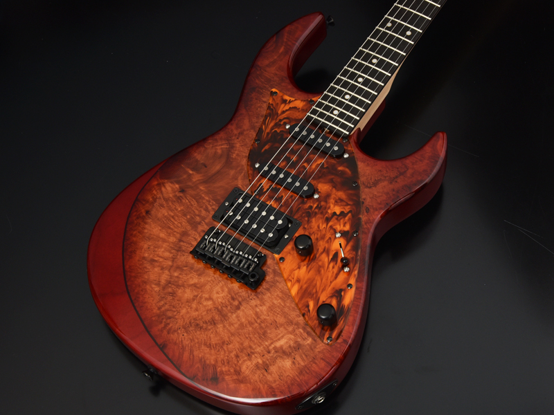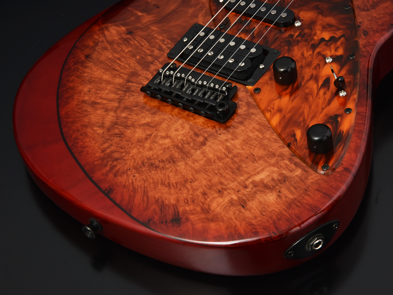 STR "James Tyler Guitars" Desgin is a guitar literally designed by James Tyler, the legendary boutique guitar builder in the USA. Though this guitar has a completely new design James Tyler created for STR brand, you will see the characteristic features of James Tyler guitars such as contours and neck profile in it. #0014 features a beautiful Imbuiya burl top finished in red burst, and comes with fire tortise pickguard.