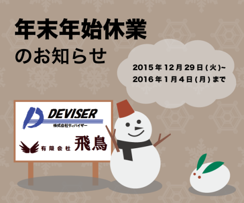 【年末年始 休業のお知らせ】 平素はお引き立てを賜りまして厚く御礼申し上げます。 誠に勝手ながら株式会社ディバイザーは2015年12月29日(火)から2016年1月4日(月)の間、休業とさせて頂きます。 お客様へおかれましてはご迷惑をお掛けすることになり、大変申し訳ございません。期間中頂きましたお問合せは5日より順次対応してまいります。 ご理解を賜りますよう心よりお願い申し上げます。 作成者:dev-web3 作成日:2015/12/24(木) 16:24