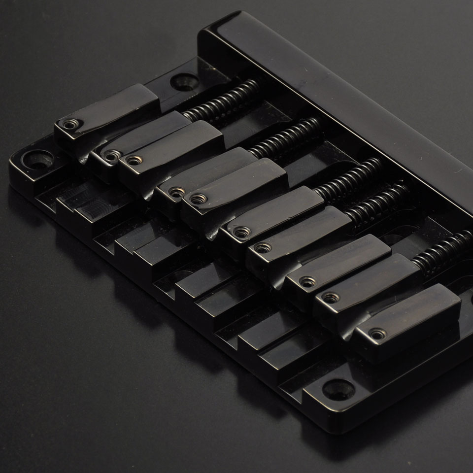 ブロックのブラス材から削り出すことで高精度、個体差のない製品に仕上がりました。ブリッジプレート上に設けられたスロットの中にサドルの一部を入れ込む構造であり、相互間をスクリューによるポイント接点ではなく面接地にすることによってより多くの振動情報をロスなく伝えます。サドルが高くなる2弦~4弦下部の、ブリッジプレートを階段状に高く設計しており、接地面積をキープすることが可能となっています。