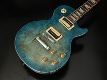 トップにはバールポプラ、バックにはマホガニーを使用。ポジションマークにはアバロンを採用し、高級感のある外観へと仕上がりました。ネックはメイプルとローズウッドの5Pを採用し、引き締まったサウンドへと仕上げられています。バール杢を生かすクリアピックガードを採用しています。