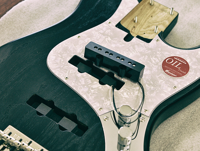 ピックアップは高さが調整できるように組み込まれており、ボディとピックアップの間にスポンジが入っています。ピックアップを固定しているビスを回すことで高さの調整が可能となります。