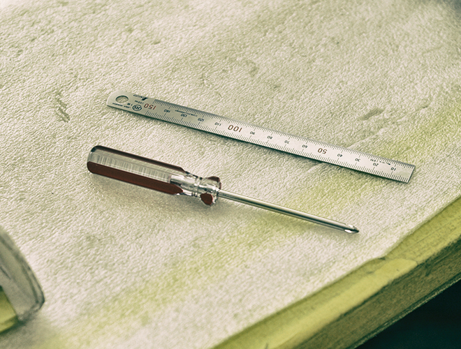 弦高調整後、スケールとドライバーを使用してピックアップの高さを確認し調整します。
