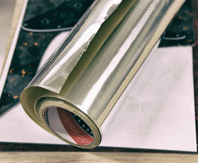 導電塗料の他にも銅テープやアルミテープを使用することがあります。ギターのコントロールキャビティの内面、ピックガードやバックカバーの裏面に貼って使用します。