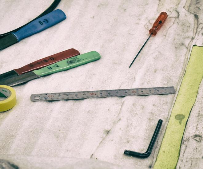 ▲ネック調整用レンチと、サドルイモネジ調整用レンチ、そしてスケールを使用します。
